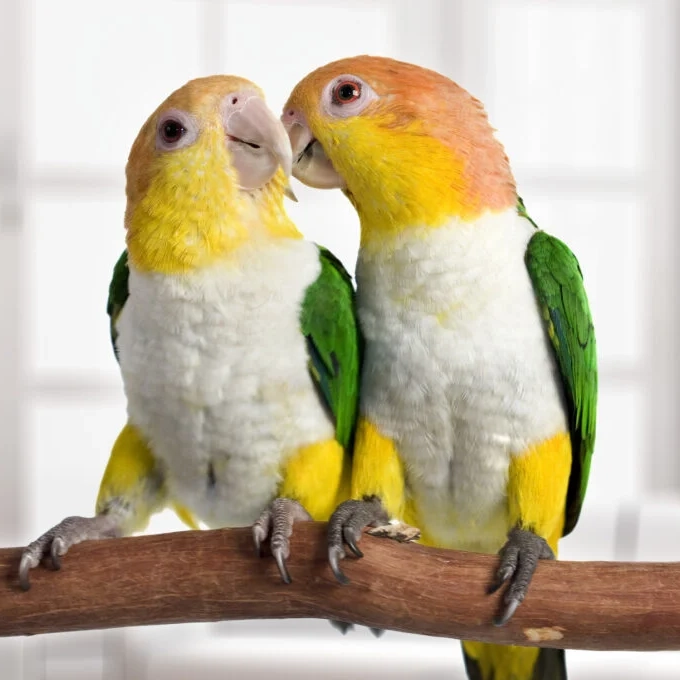 Well known as the clown of companion birds, caiques are loved by bird fanciers for their outgoing nature and ability to make people laugh with their playful antics. The proper way to pronounce caique is “kai-eke”-don’t ask for a “cake” at the bird shop, or they might point you to the nearest bakery!