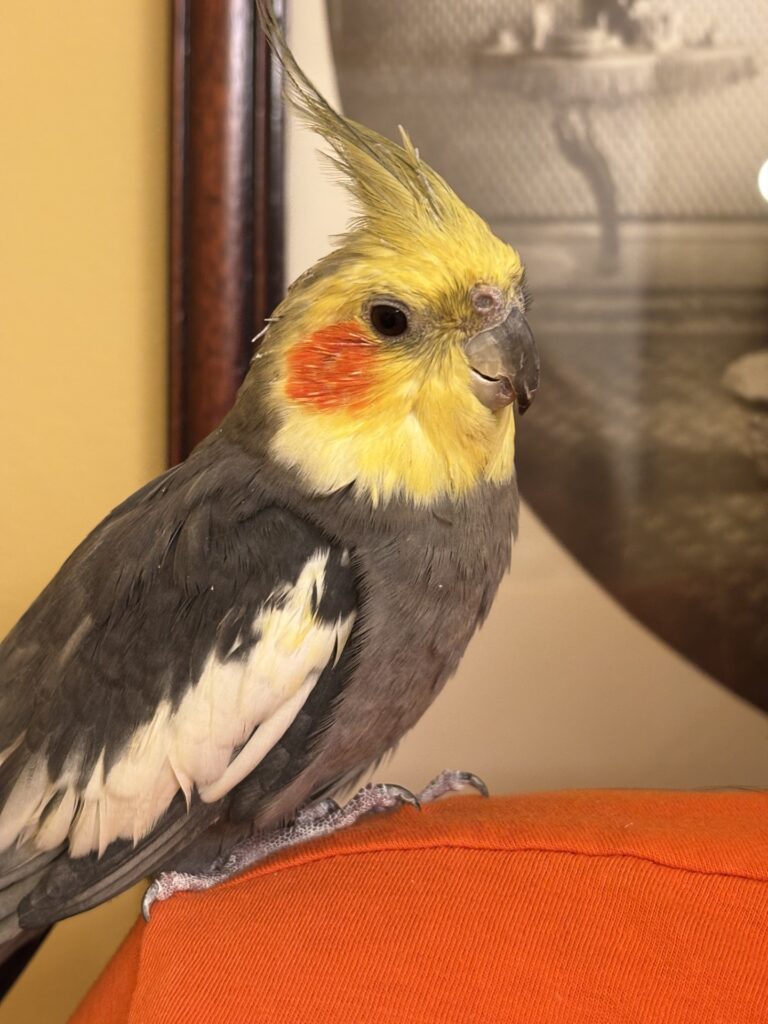 The position of a cockatiel’s crest feathers can tell you its mood. Straight-up crest feathers can mean the bird is startled or highly curious. A defensive cockatiel will hold its crest feathers flattened close its head, and it might be especially stressed if it also hisses. A relaxed cockatiel will have slightly held back crest feathers, as well as fluffed cheek feathers and you might also hear it contently grinding its beak.